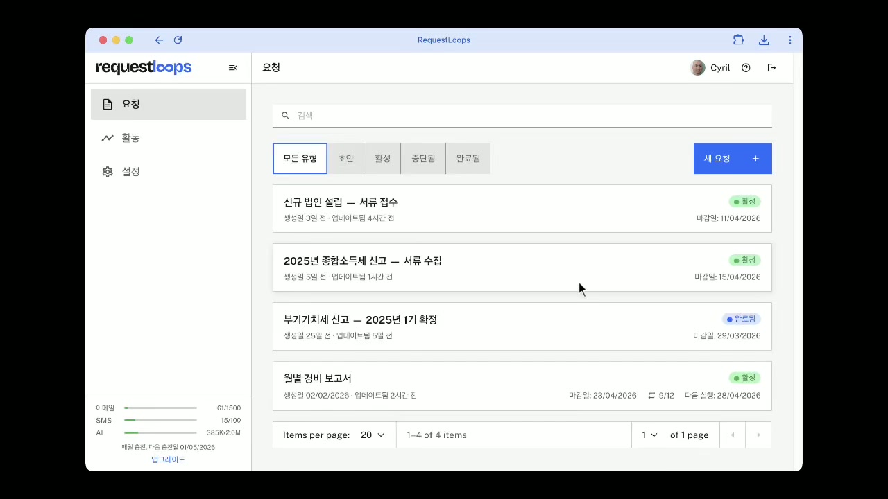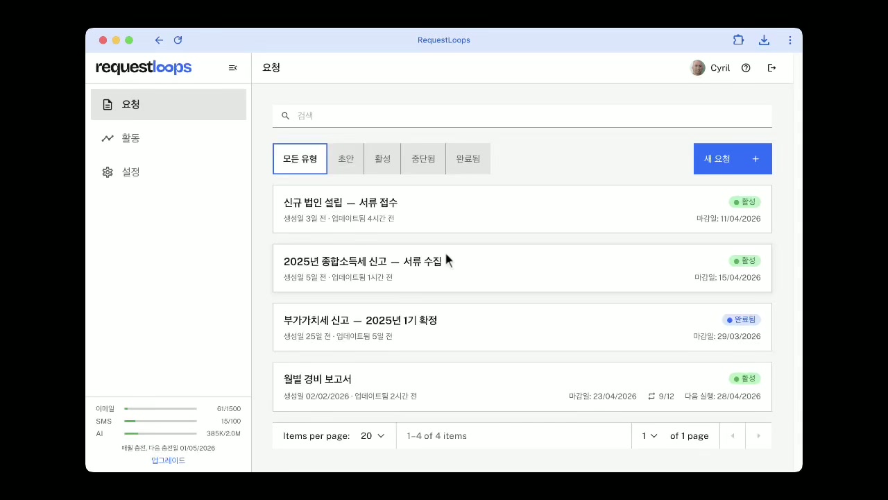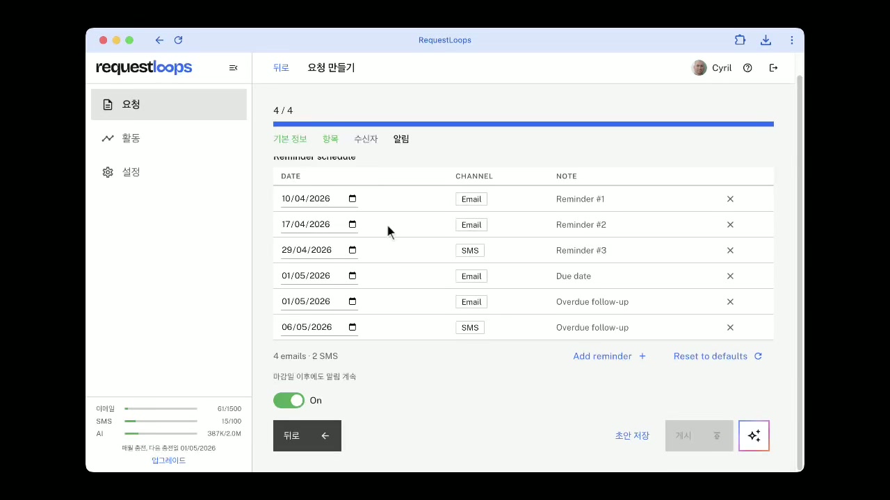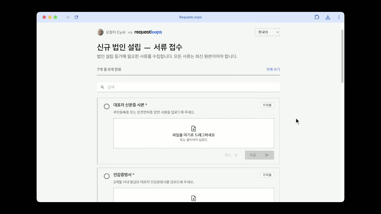 요청을 만들고, 수신자를 추가하고, 나머지는 RequestLoops에 맡기세요. 자동 리마인더, 실시간 추적, AI 지원 양식 작성.